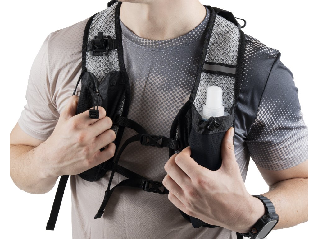 Die Vorderseite erinnert an eine Laufweste mit praktischem Brustverschluss und Taschen für Flaschen oder Gels, während die Rückseite ausreichend Stauraum wie ein kompakter Rucksack bietet.